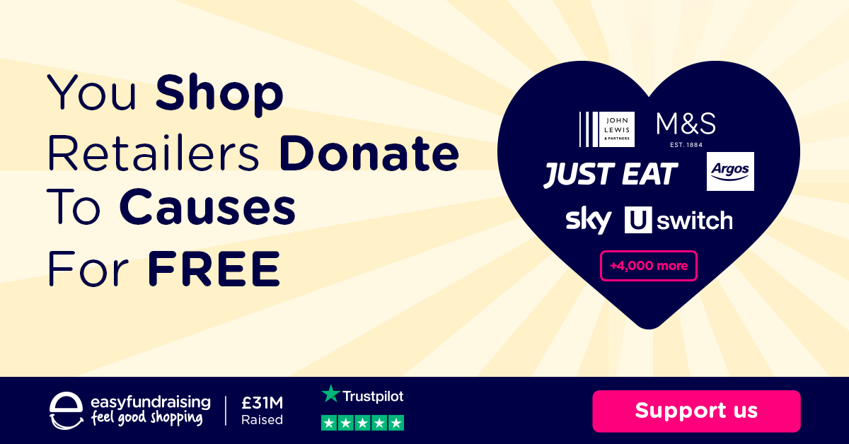 Easyfundraising has over 4,000 shops and sites which will donate to us at no extra cost to yourself, including lots of big name retailers like John Lewis, Argos, Uswitch, eBay, M&S, Just Eat, Now TV, Domino's Pizza and Audible. All you have to do is sign up to support us using the link below. Then every time you shop online, go through the easyfundraising website or App and we’ll receive a % of your spend as a free donation, at no cost to you or us.